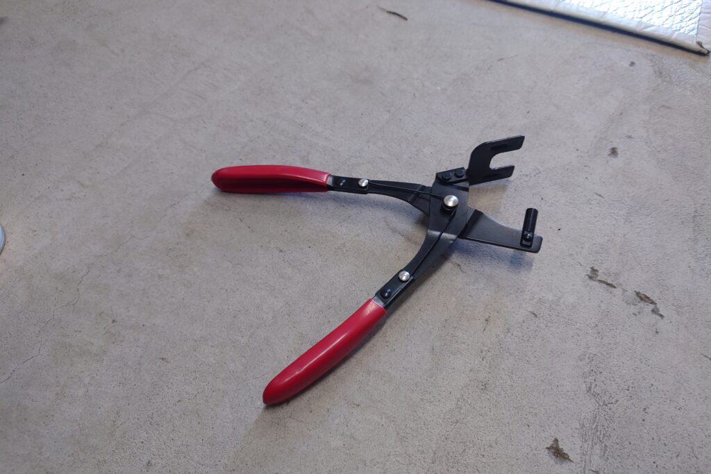 マフラーハンガープライヤー2025年10月23日工具 買ってきた。 欲しかったわけでもないけど工具屋に行った時に見つけた品。なくて困るものではないけど、吊りゴムは意外と硬いし外れにくい…。 ウマであげた程度のスペースでも快適にマフラーが外せた。オススメ度は高め。