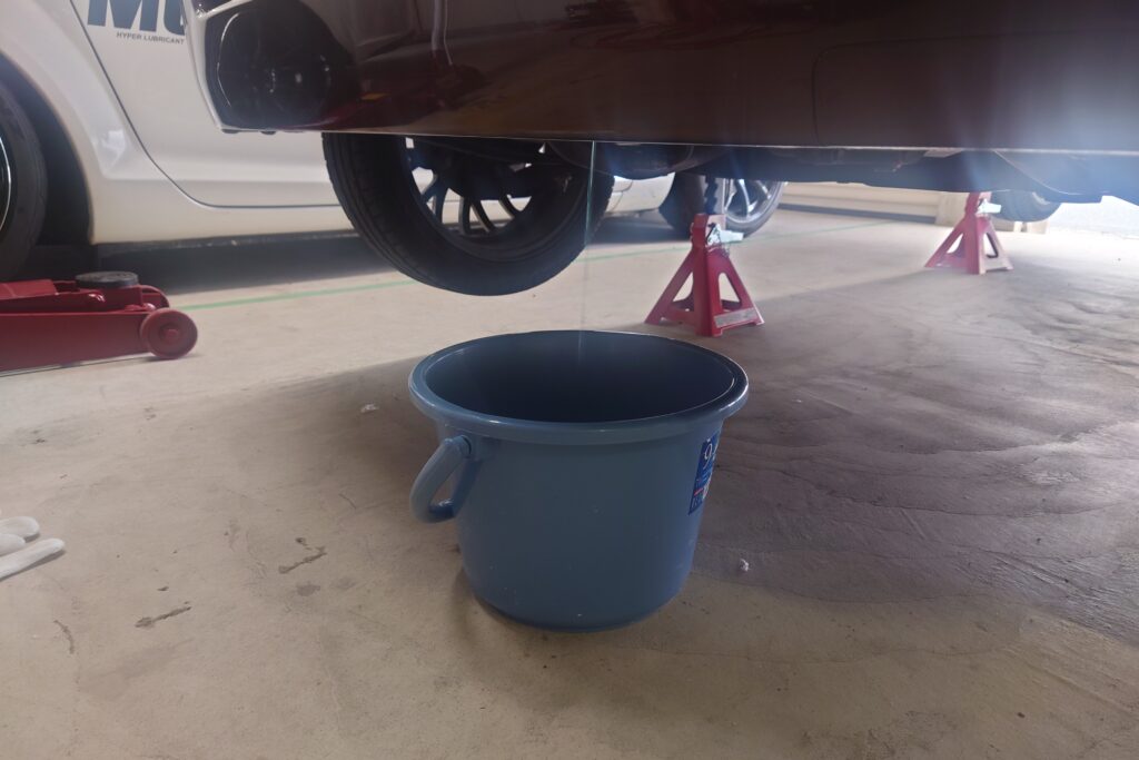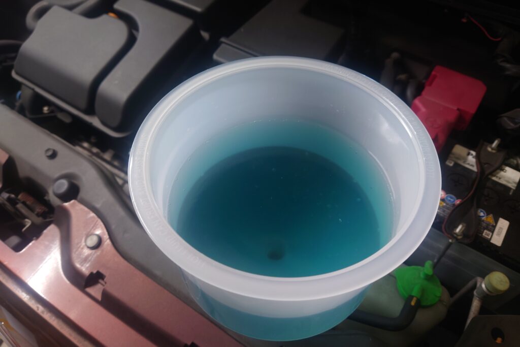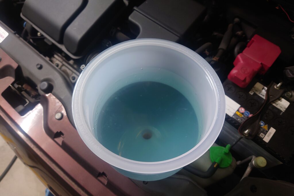 サブタンクを覗いたときは黒く濁った液体に見えたのでヤバそうな気がしていたけど実際にLLCを抜いてみると青色の液体が出てきた。