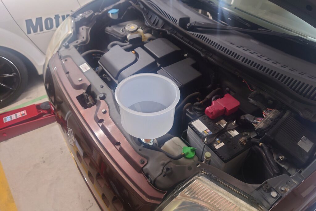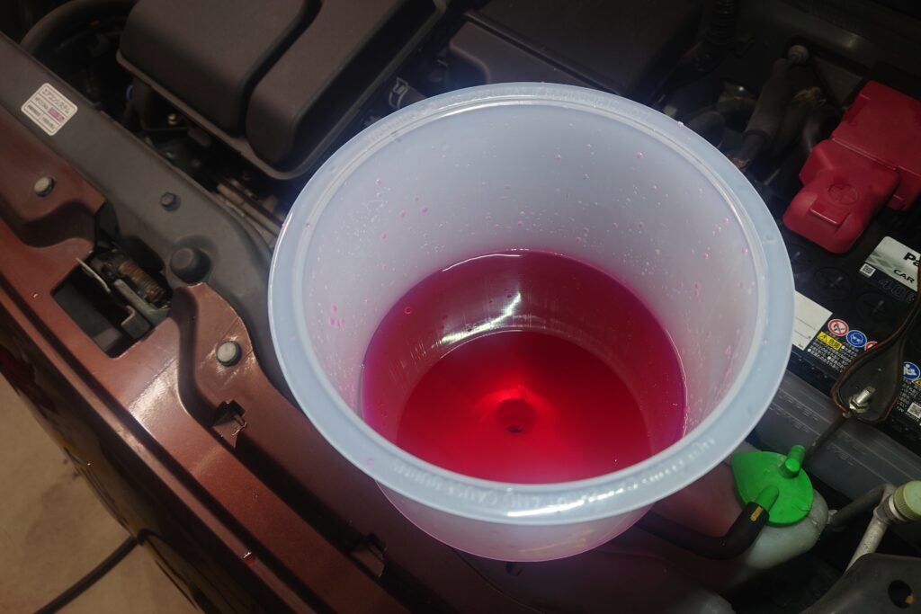 今回交換するのは赤色のLLCなので色が混ざって茶色くなると精神衛生上よろしくないので、水を回して色を薄めることにした。